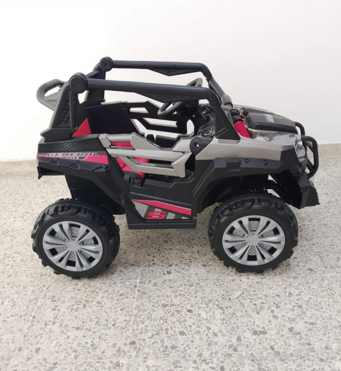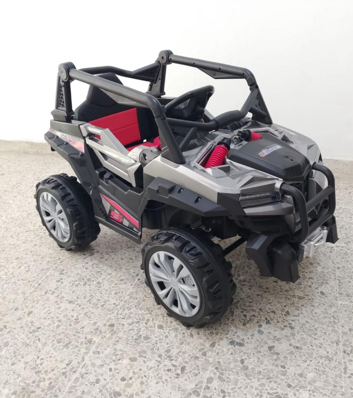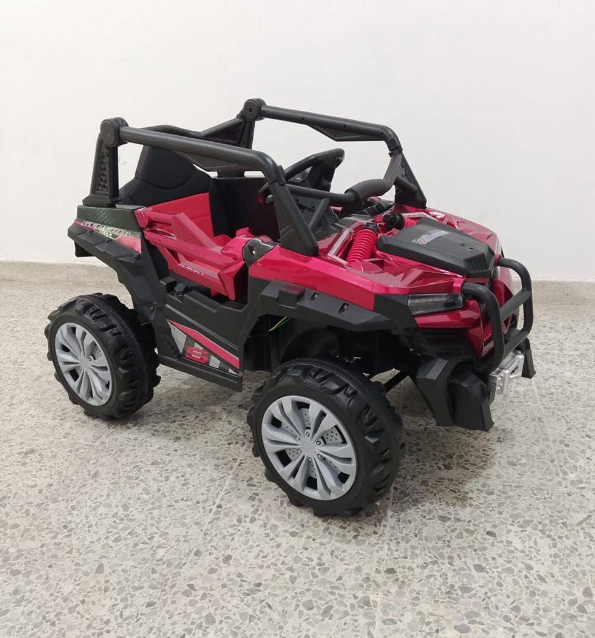 Batería de 12V 7Ah para larga duración Cinco motores independientes para máximo rendimiento Control remoto parental para seguridad en todo momento Asiento tipo cuero para confort superior Luz LED frontal para visibilidad y diseño realista Sonido de arranque realista para inmersión total Entrada USB y melodías integradas para entretenimiento personalizado Funciones de avance, reversa, posición neutra y modo mecedora Llantas de goma para tracción superior en cualquier superficie