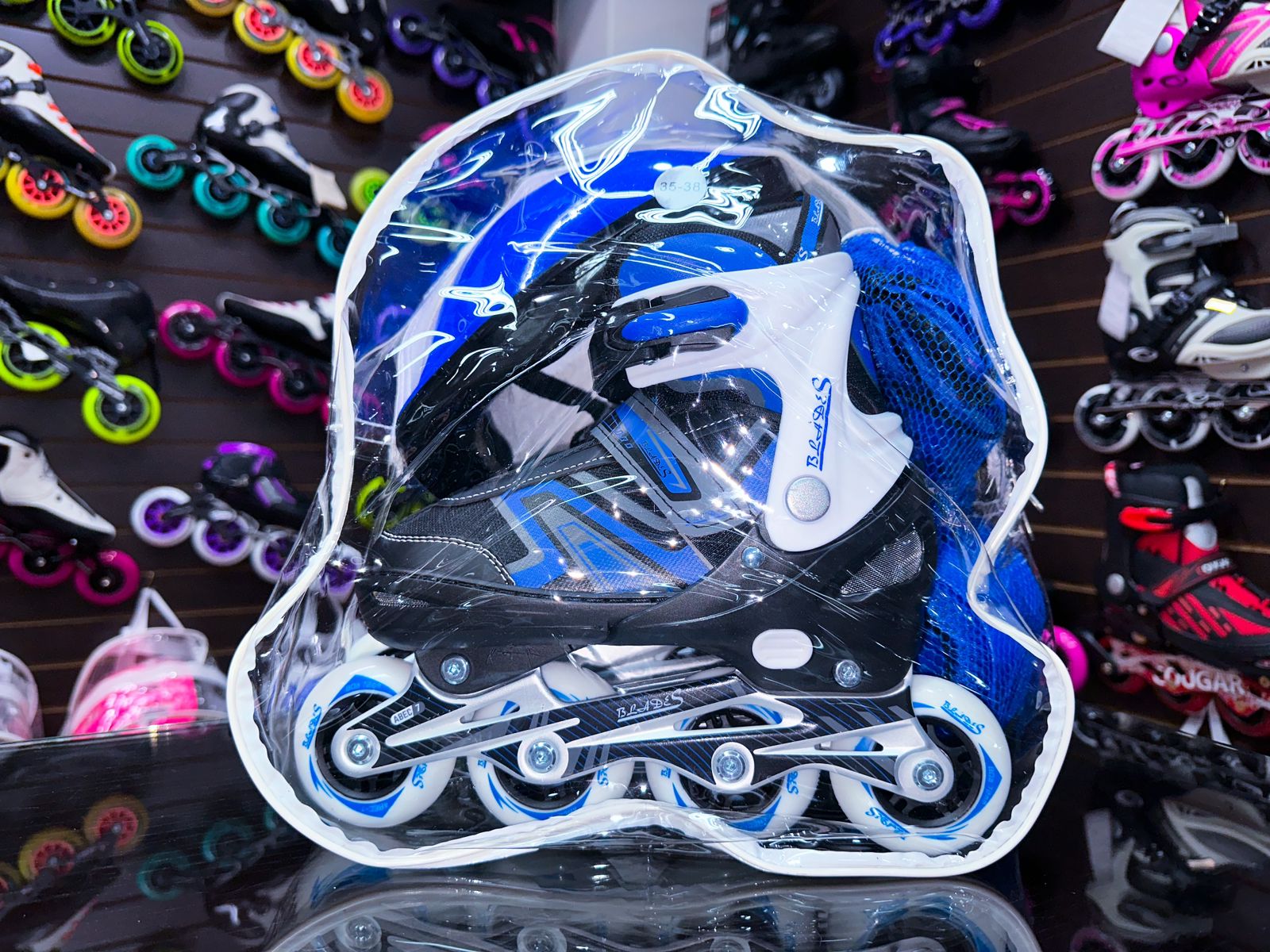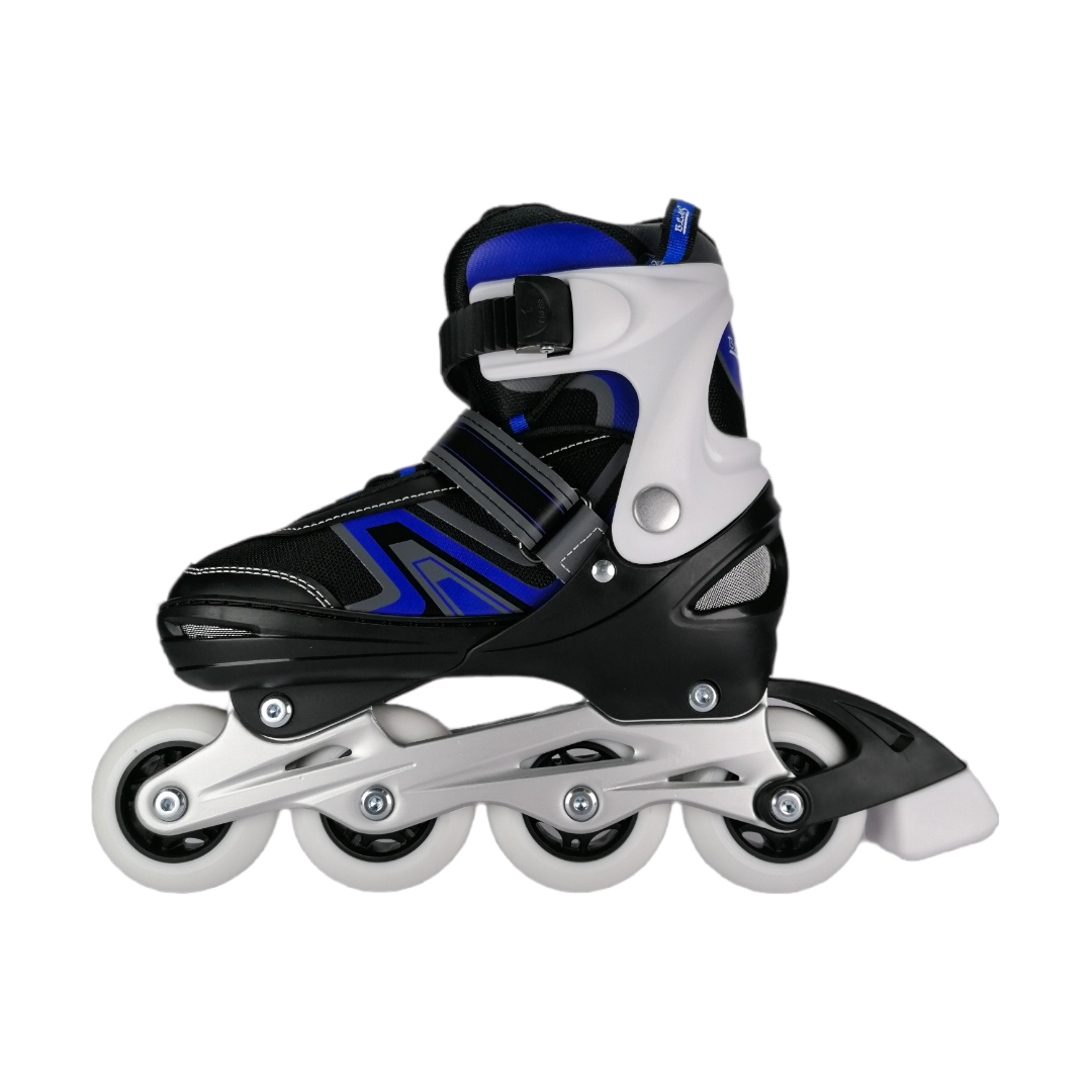 Talla 31-34 Azul – PATINES EN LÍNEA KIT BLADES NEGRO | Recomendación de talla: Adquiere 2 tallas más que tu calzado habitual (ejemplo: si calzas 29, elige 31). Este modelo corresponde a S (31 ajustables a 34). | Incluye: Casco, rodilleras, coderas, guantes anti-fracturantes, stickers decorativos, llaves y factura. | Ajuste de tallas: XS (27-30), S (31-34), M (35-38). | Tamaño de ruedas: XS (3 ruedas de 64mm), S (4 ruedas de 64mm), M (4 ruedas de 72mm). | Color: Negro. | Ajuste: Cordones + hebilla + velcro. | Tornillos de anclaje: Aluminio. | Acolchado: 2 cm. | Chasis: Aluminio. | Ruedas: Goma 82A. | Freno: Par derecho.